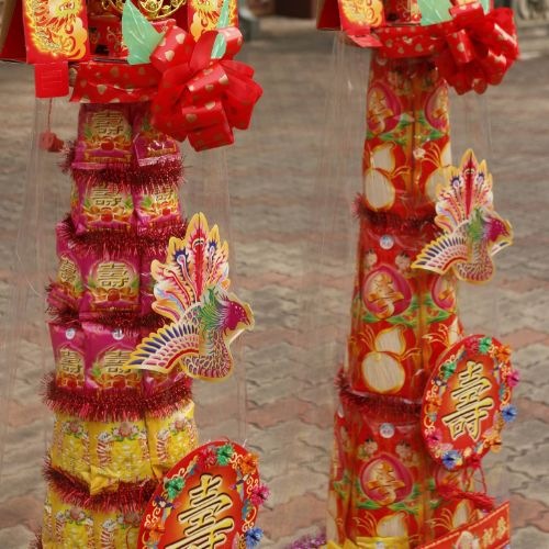 以壽麵、壽桃疊成的「壽桃塔」一對來供獻,在兩座塔旁邊分別掛上紅賀條兩幅,右畫神名、左寫信徒姓名,除了有祝賀神明生日之意,也有為家中添福添壽作用。萬毅「壽桃塔」就是盤桃匯集成塔的意思