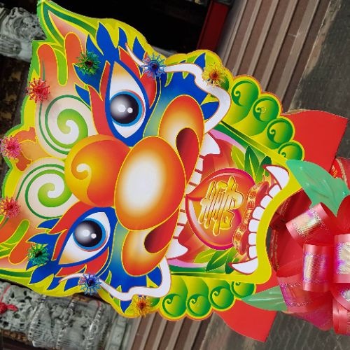 以壽麵、壽桃疊成的「壽桃塔」一對來供獻,在兩座塔旁邊分別掛上紅賀條兩幅,右畫神名、左寫信徒姓名,除了有祝賀神明生日之意,也有為家中添福添壽作用。萬毅「壽桃塔」就是盤桃匯集成塔的意思