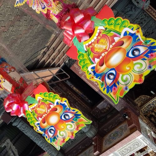 以壽麵、壽桃疊成的「壽桃塔」一對來供獻,在兩座塔旁邊分別掛上紅賀條兩幅,右畫神名、左寫信徒姓名,除了有祝賀神明生日之意,也有為家中添福添壽作用。萬毅「壽桃塔」就是盤桃匯集成塔的意思