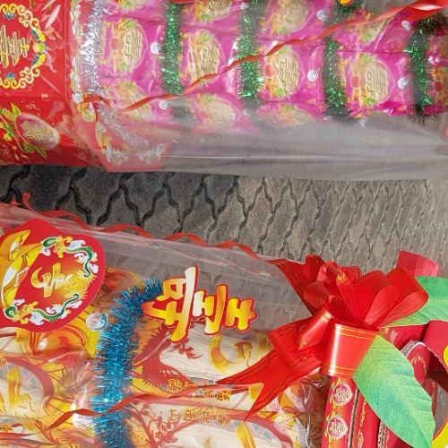 2本產品以「對」為單位,內容物食品可任選「麵條、壽麵、關廟麵」「果凍、鳳梨餅、桃酥、煎餅、方塊酥、鳳梨酥、沙其瑪、米果、菜脯餅、爆米花」我們會跟客人溝通後才開始製作