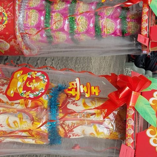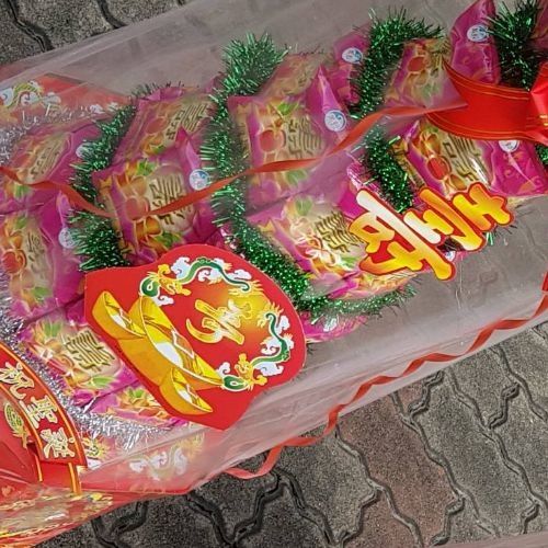 2本產品以「對」為單位,內容物食品可任選「麵條、壽麵、關廟麵」「果凍、鳳梨餅、桃酥、煎餅、方塊酥、鳳梨酥、沙其瑪、米果、菜脯餅、爆米花」我們會跟客人溝通後才開始製作
